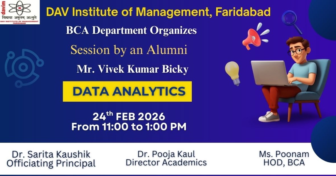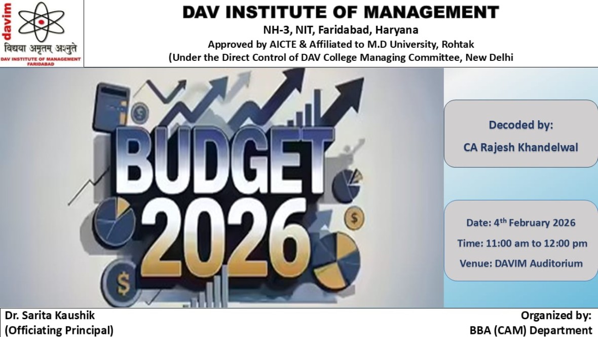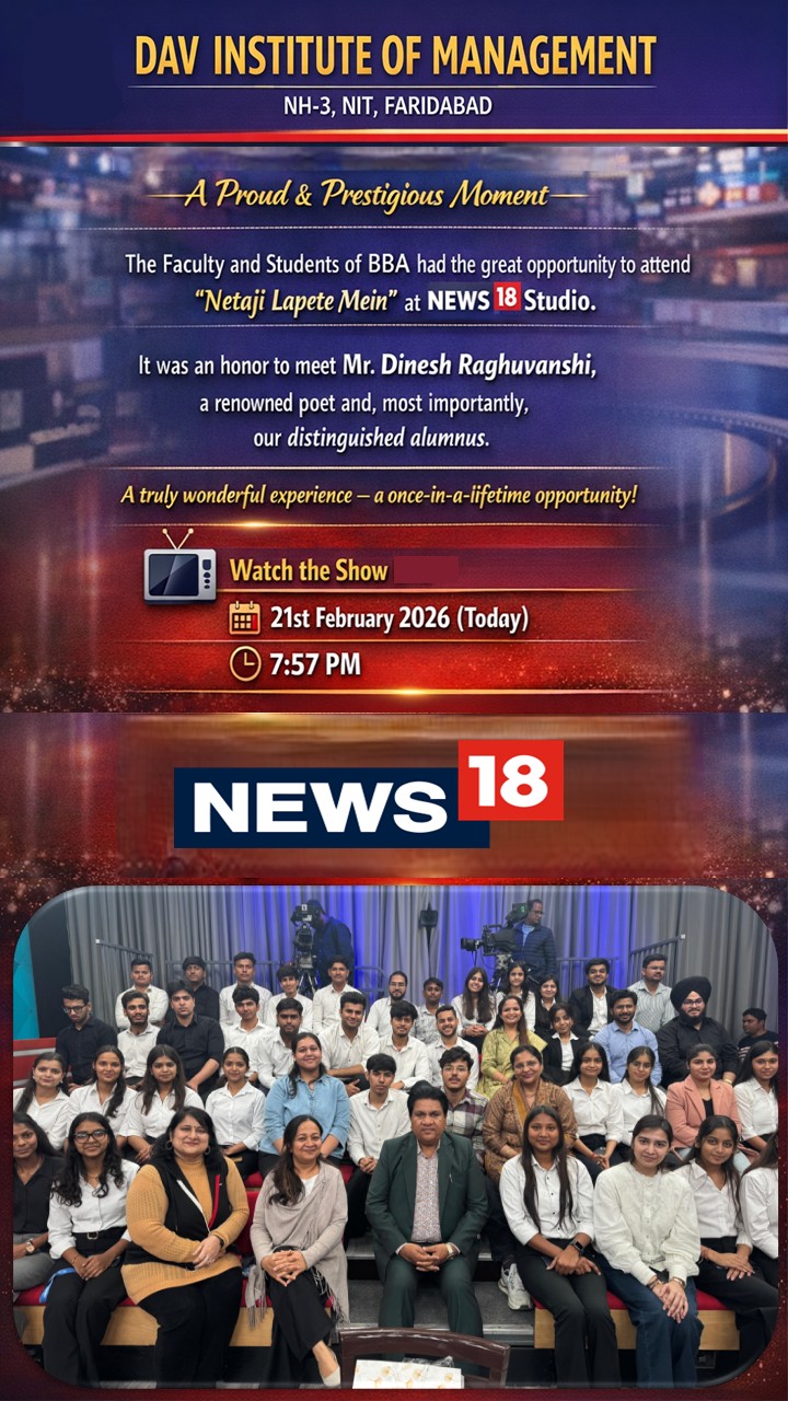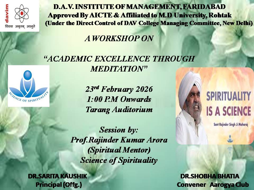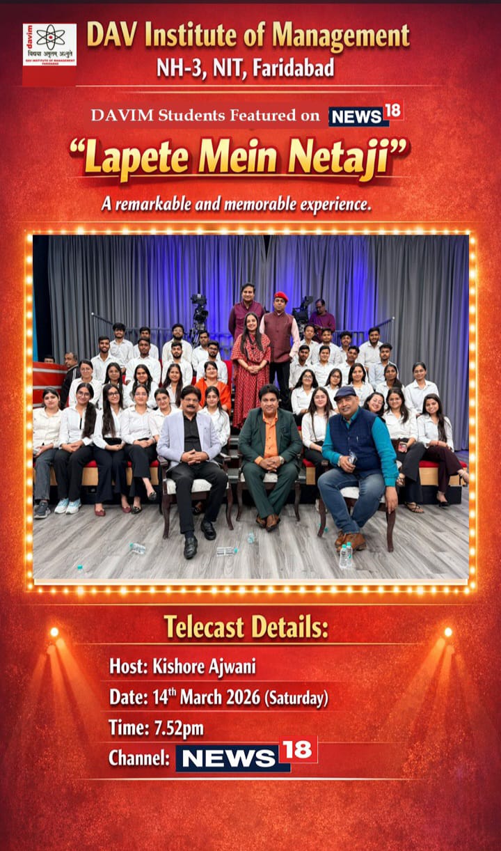 DAV INSTITUTE OF MANAGEMENT , CNCR (Faridabad) was established on 12th October 1997 by DAV College Managing Committee, New Delhi, with Vedic values embedded in the educational vision.