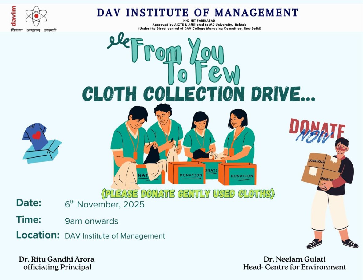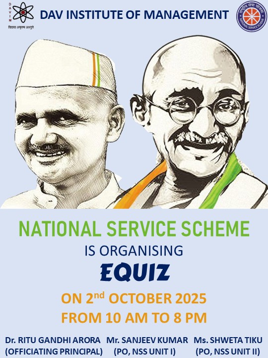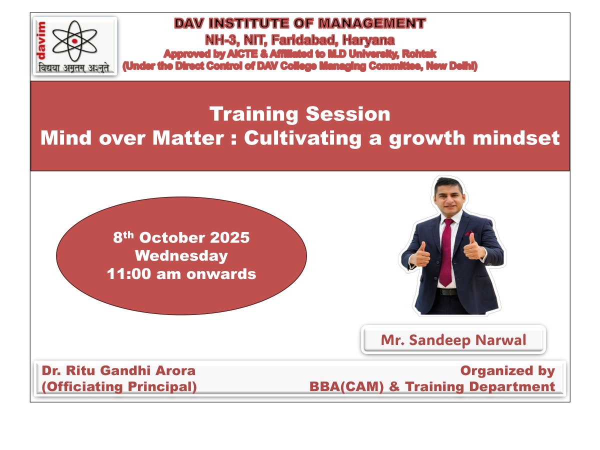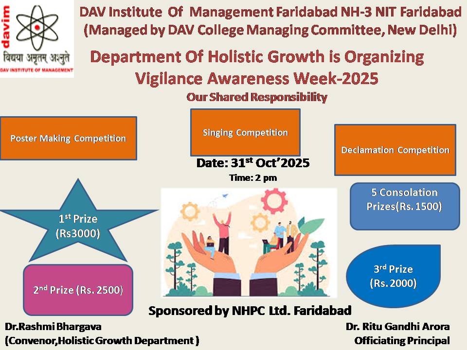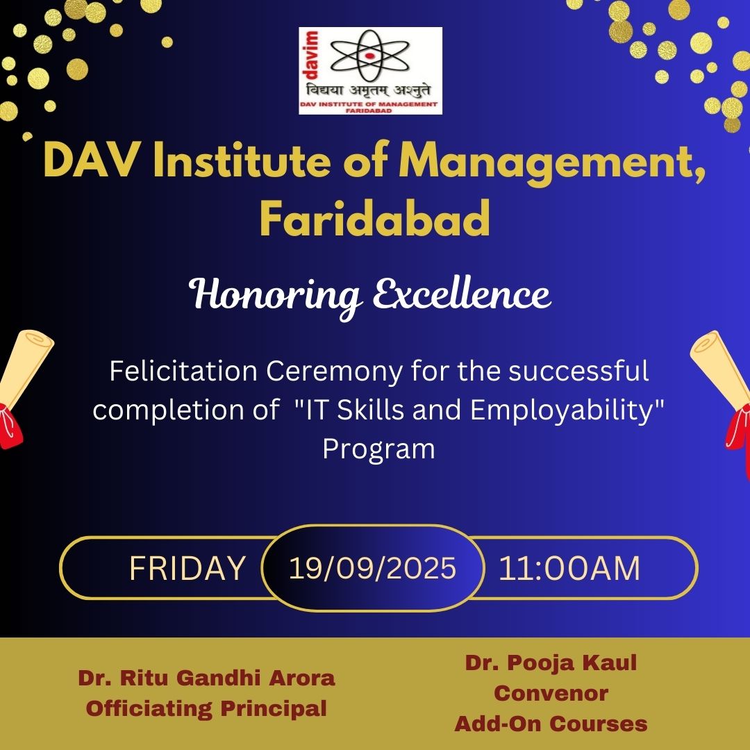 DAV INSTITUTE OF MANAGEMENT , CNCR (Faridabad) was established on 12th October 1997 by DAV College Managing Committee, New Delhi, with Vedic values embedded in the educational vision.