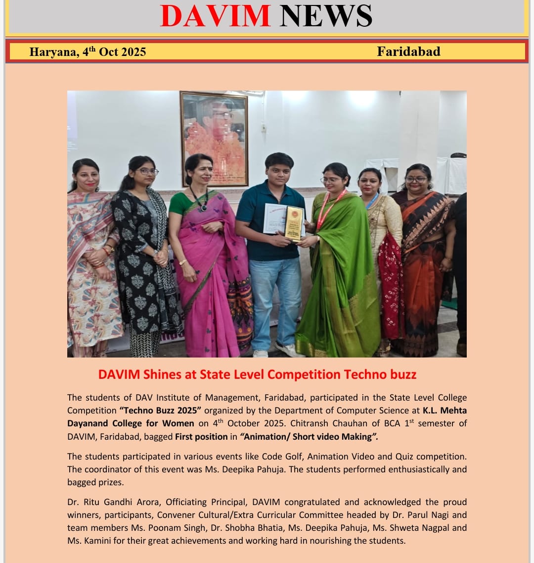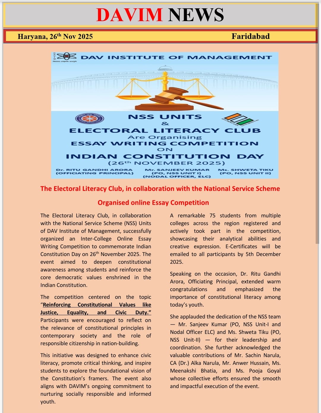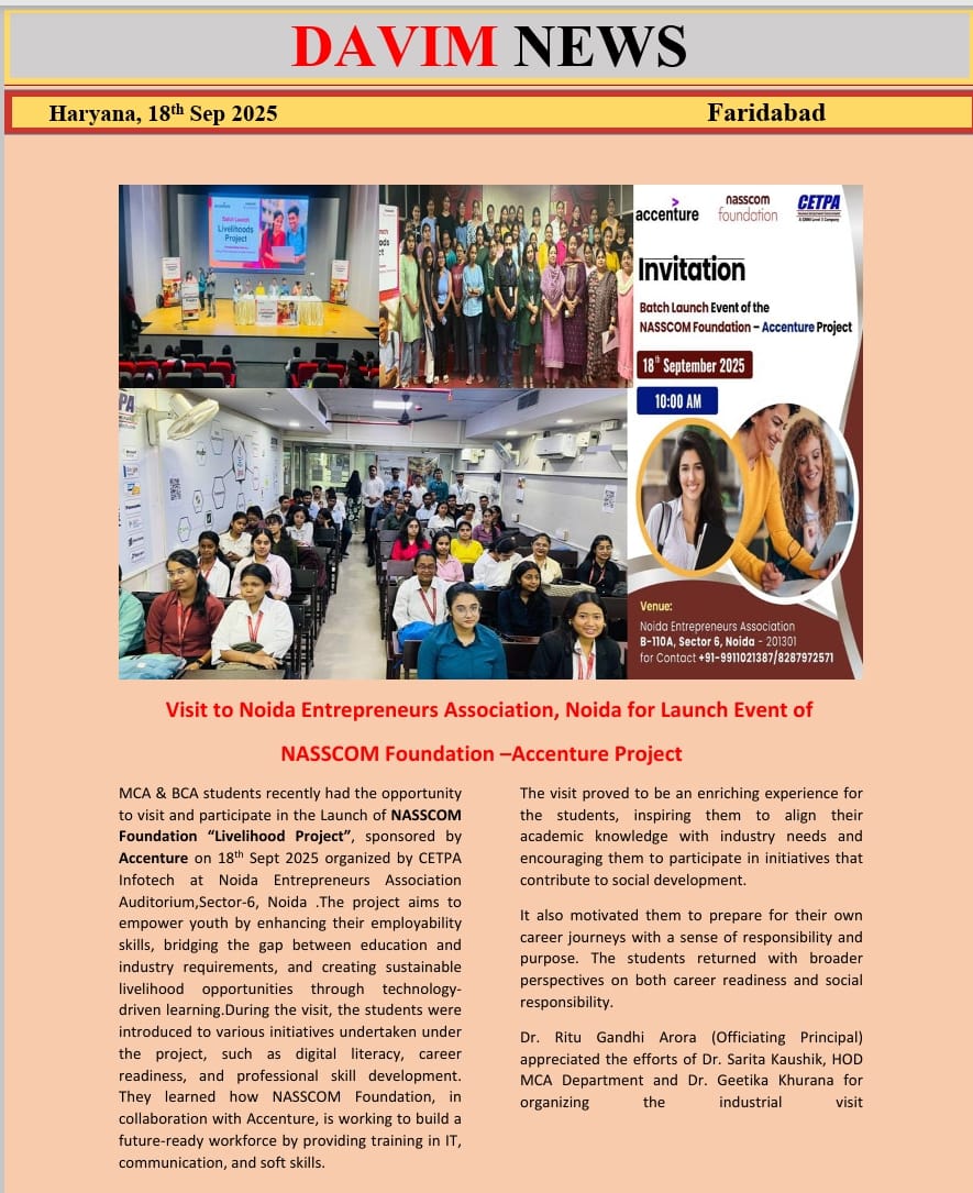 DAV INSTITUTE OF MANAGEMENT , CNCR (Faridabad) was established on 12th October 1997 by DAV College Managing Committee, New Delhi, with Vedic values embedded in the educational vision.